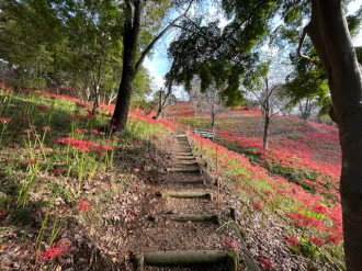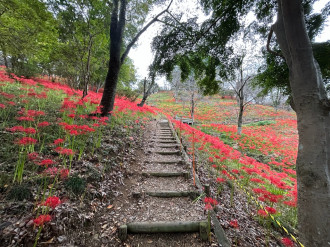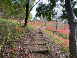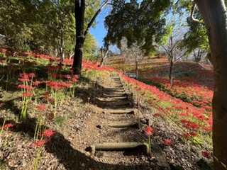 城山公園の彼岸花は6分咲きです。場所によっては見頃を迎えております。遊歩道内は譲り合って通行してください。