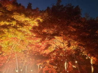花の山の紅葉は見頃を迎えています。昼間は陽の光を受けて美しく色づき、夜はライトアップで幻想的な世界が広がります。(開園時間20:00まで延長)