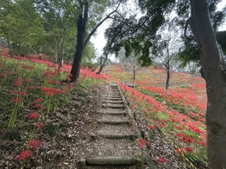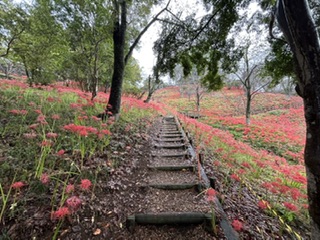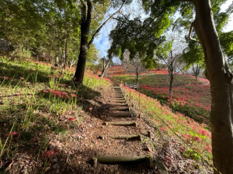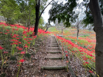 城山公園の彼岸花は6分咲きです。場所によっては見頃を迎えております。遊歩道内は譲り合って通行してください。